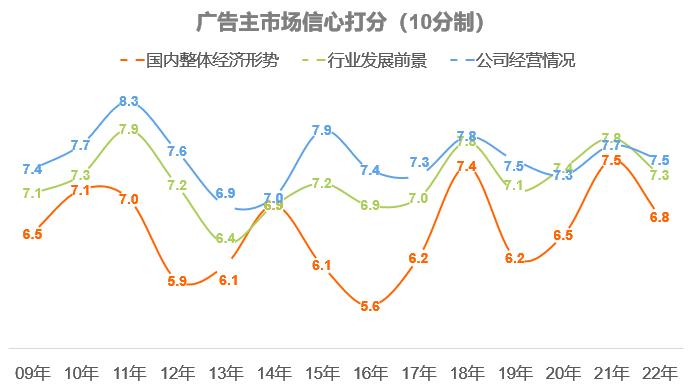 ●《2022中國廣告主營銷趨勢調(diào)查》報告(以下簡稱報告)顯示,2022年受疫情反復、行業(yè)變革等國內(nèi)外復雜環(huán)境影響,廣告主的信心指數(shù)(廣告主針對國內(nèi)整體經(jīng)濟形勢、行業(yè)發(fā)展前景、公司經(jīng)營情況的信心打分)相對于2021年有所回落,但仍高于2020年的疫情之初。
