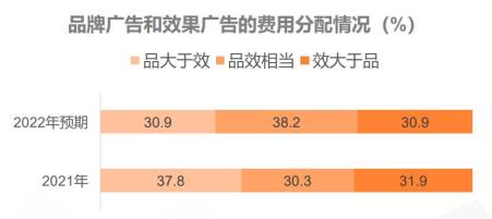 ● 報告顯示,2021年廣告主將52.5%預算用于品牌廣告、47.5%用于效果廣告。而在2022年,廣告主品效預算占比的差額進一步收窄,分配預期更加均衡。