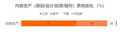● 媒體廣告、內(nèi)容營銷、私域運營、行業(yè)公關(guān)等所有營銷行為,都需要內(nèi)容填充。隨著算法極大縮短了內(nèi)容傳播的周期,廣告主對內(nèi)容的需求會呈現(xiàn)冪次增長,內(nèi)容生產(chǎn)和產(chǎn)品生產(chǎn)一樣,成為企業(yè)的重投入。報告顯示,57%的被訪廣告主在2022年增加內(nèi)容生產(chǎn)的費用投入。