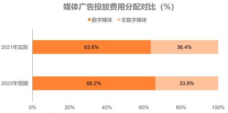 ● 2021年的調(diào)查顯示,數(shù)字媒體獲得了更多的廣告預算,費用占比為63.6%。到了2022年,數(shù)字媒體的分配占比將再提升近3個百分點。