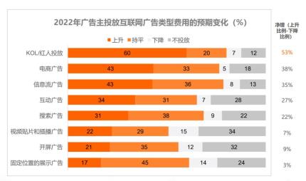 ● 互聯(lián)網(wǎng)廣告類型方面,2022年六成廣告主預期會增加KOL/紅人的投放費用。紅人擁有粉絲群體,自帶流量,擁有穩(wěn)定的原創(chuàng)內(nèi)容輸出能力,同時,在不同紅人之間可以形成組合投放,在電商大促等大型推廣環(huán)節(jié)可以實現(xiàn)品牌聲量放大。相比之下,視頻貼片和插播廣告、固定位置展示廣告和開屏廣告的投放費用下降率較高,廣告主對純展示類的互聯(lián)網(wǎng)廣告類型興趣下滑。