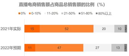 ● 報告顯示,2021年半數(shù)廣告主表示,直播電商渠道的商品銷售額占總銷售額的比例在0-10%的區(qū)間,多數(shù)廣告主預期2022年會有所上漲。