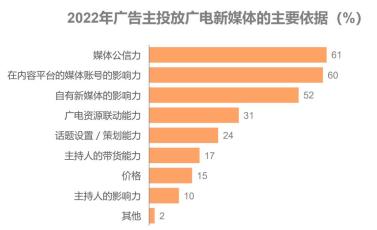 ● 六成以上的廣告主2022年已經(jīng)或者將會在廣電新媒體上投放。媒體公信力是廣告主投放廣電新媒體的首要依據(jù),這表明媒體權(quán)威性和價值觀能夠在數(shù)字和非數(shù)字媒體貫通,也是廣電新媒體的獨特優(yōu)勢所在。